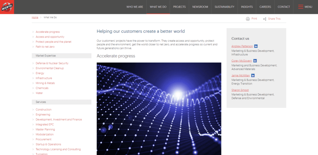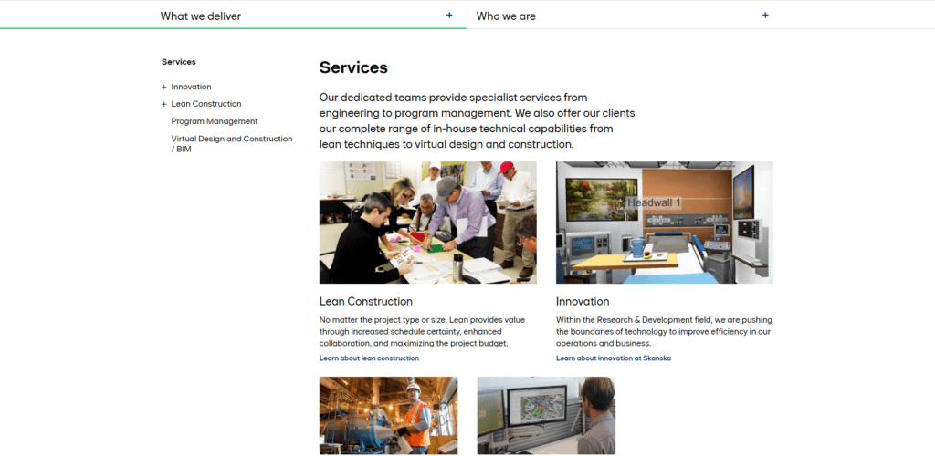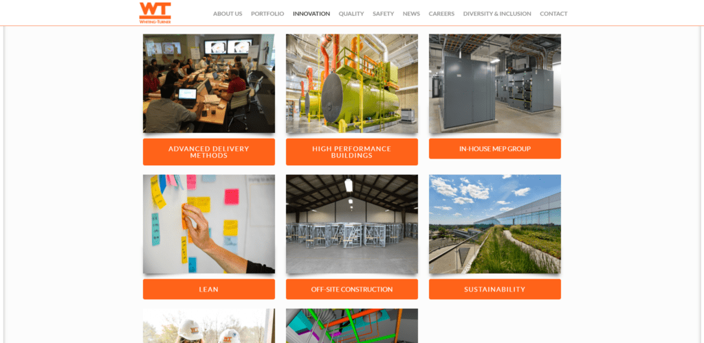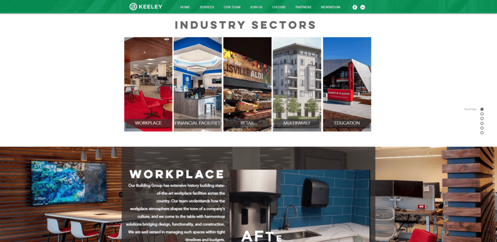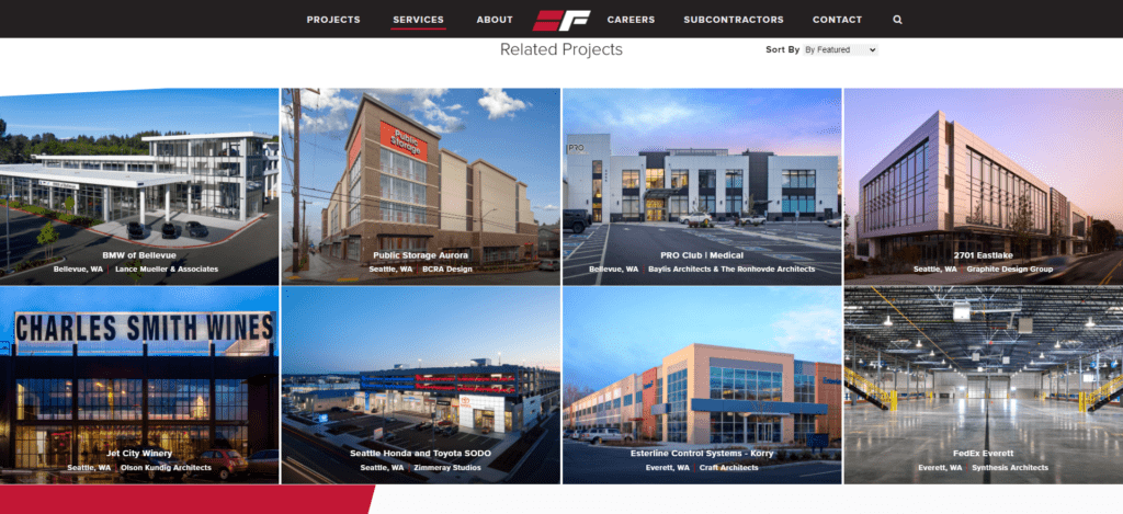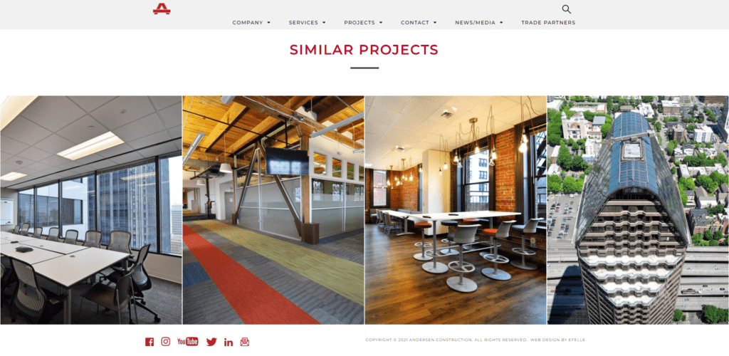 Almost all the sites I reviewed had at least some kind of projects section. The majority shared a main page with images that allowed people to sort by industry and click to view more information about each project.  Smart idea. That helps drive traffic to your site and shows people how successful you are!