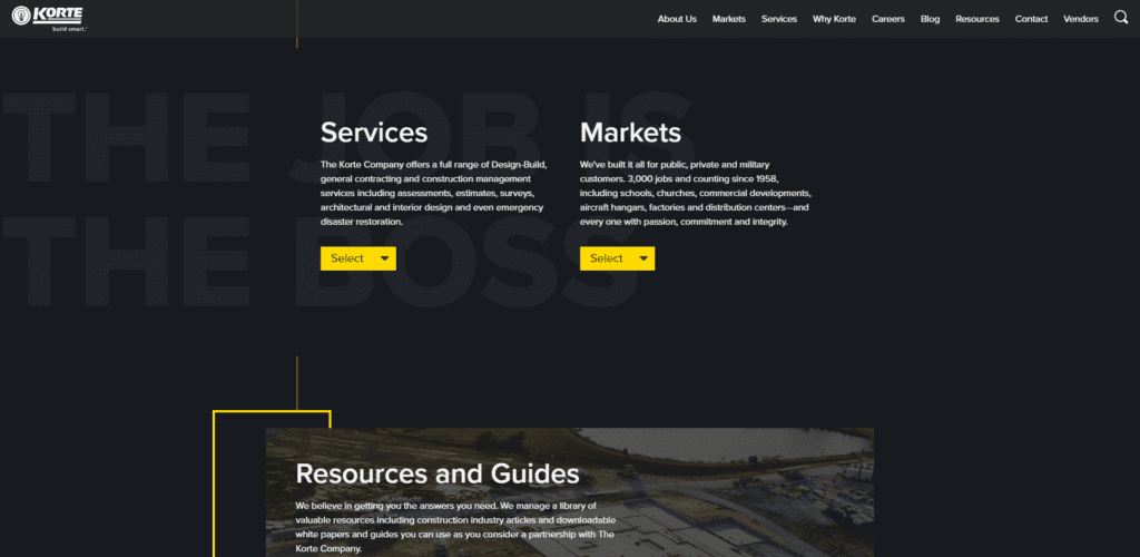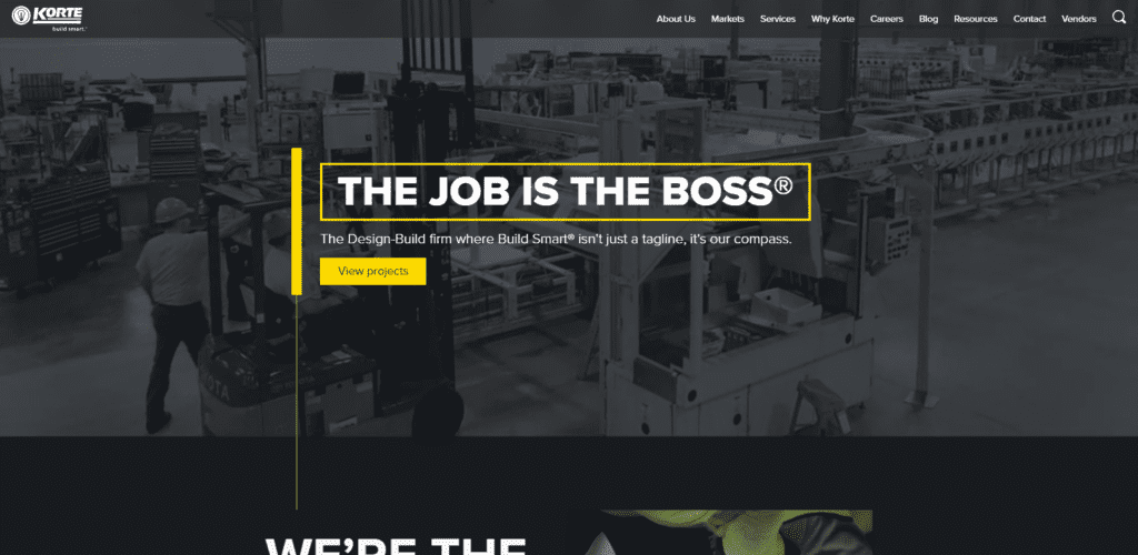 Some fun trends that aren’t super prevalent across the board but I’m noticing more and more often are angled page breaks, loading numbers and using text as a design element. Korte Co. does text as design exceptionally well.