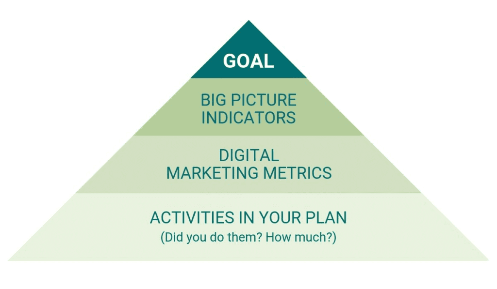 At the bottom is your plan: all the activities that you’ll execute to implement the marketing plan, asking yourself questions like, “Did you send your emails?” At the narrow top is the end goal of your campaign — that defines your most important metric. For most people, it’s going to be increasing sales.