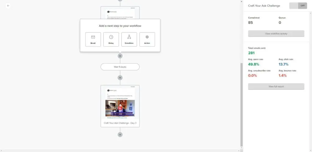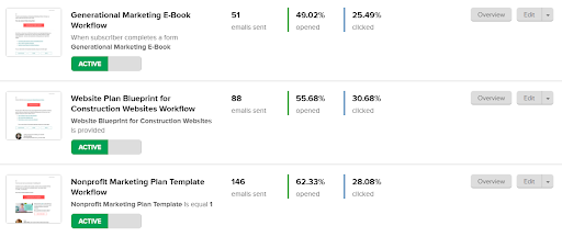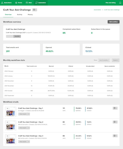The view is pretty spread out so I don’t get as much information at a glance, it’s not as easy to skim as MailerLite.
