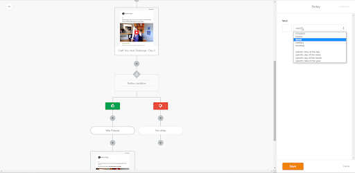 The workflow user interface is easy to use and intuitive. Click a “+” to add more steps. Then choose the type of step you’re adding and customize the step in the right column.
