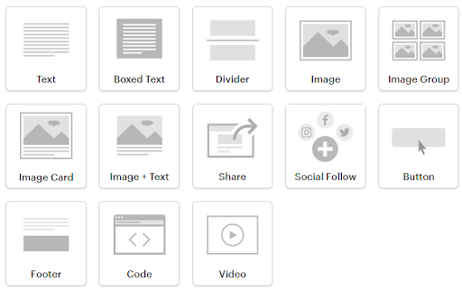 There are SOOO many content blocks to choose from. Lots of different layouts with images, buttons, text all arranged and ready to drag and drop in place. All that pre-designed goodness comes with the drawback of figuring out how to customize it for your particular purpose though. I often find myself starting with a block and then ditching it to just use the normal MailChimp like blocks instead.