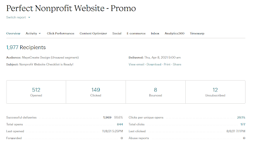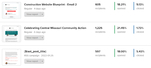The RSS feed emails are all reported into one email that you have to click on to view data. Which is good and bad. Good because you can see the overall performance metrics easily. Bad because you can’t tell which email had what subject line and you have to click on each and everyone to see the data.