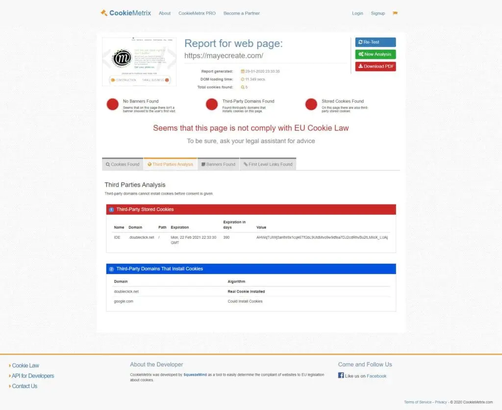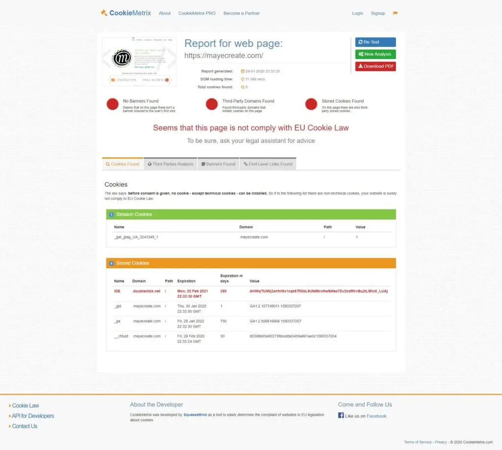 This is the one I found that didn’t require me to sign up for a free trial or give my email to get the results. It confirms the same cookies displayed on my browser developers tab but has a less techy and more user-friendly interface.